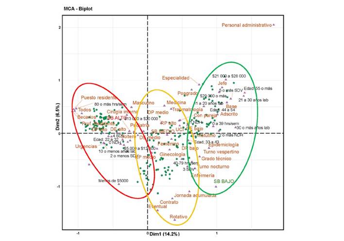 En la Figura 3 se presenta el ACM para caracterizar a la población de estudio, lo que permite observar tres grupos. En el área delimitada por la línea roja, se encuentra el grupo caracterizado por presentar un alto SB, relacionado con quienes cubren todos los turnos, trabajan en los servicios de pediatría y urgencias, tienen jornadas laborales de más de 80 horas a la semana, llevan menos de una década laborando, tienen entre 22 y 32 años, son solteros/as y perciben un salario de entre $5,000 y $12,000 pesos al mes. En otras palabras, estas son las características típicas de los médicos residentes.