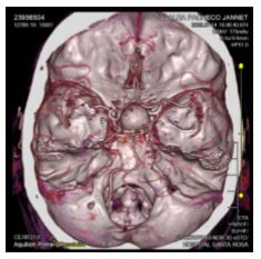 Figure 2. CT angiographic reconstruction of the brain. Approximate measurements of 20.6 x 1.6 x 16.7 mm in the anteroposterior, transverse and craniocaudal dimensions, with involvement of the sella turcica and originating from the right internal carotid artery.